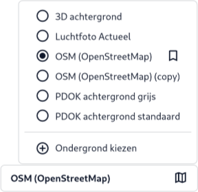 De kaartlagen in de dropdown zijn door de beheerder aangemerkt als standaardondergronden en worden als beschikbare opties weergegeven. De actieve ondergrond is gemarkeerd met een bolletje. Door op een andere ondergrond in de lijst te klikken, wissel je de actieve basislaag.
