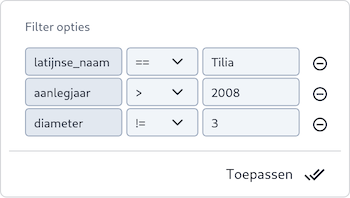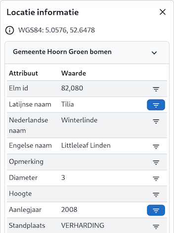 Met de filterfunctie kunnen gebruikers zoeken naar specifieke objecten binnen een kaartlaag. Deze functionaliteit is beschikbaar voor alle Vector-kaartlagen.