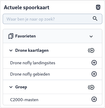 Via het Kaartlagen (C) paneel kunnen specifieke kaartlagen eenvoudig toegankelijk gemaakt worden door deze op te slaan als persoonlijke favoriet. Via onderstaande stappen kan een kaartlaag worden gemarkeerd als favoriet.