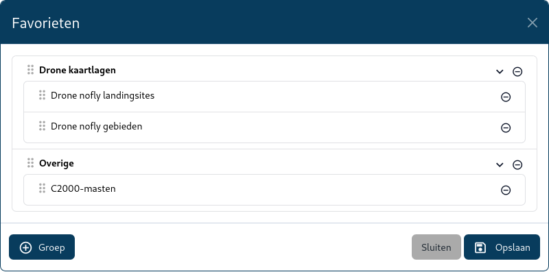 De favorieten functie van MapGallery stelt gebruikers in staat om specifieke kaartlagen eenvoudig toegankelijk te maken door deze op te slaan als persoonlijk favoriet. De kaartlagen kunnen worden ingedeeld in eigen groepen. Hieronder volgt een beschrijving van hoe deze functionaliteit werkt.